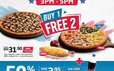 Happy Hour is here! 🎉 From 12pm-5pm, enjoy up to 55% off your favorite pizzas and bread sides with Buy 1 Free 2 Deal! 🍕 Complete your order with a bottle of 1.5L Pepsi (50% off) at only RM 3.95. Use Code: ZERO1 (Regular) ZERO2 (Large) ZERO3 (XtraLarge). Limited Time Offer.